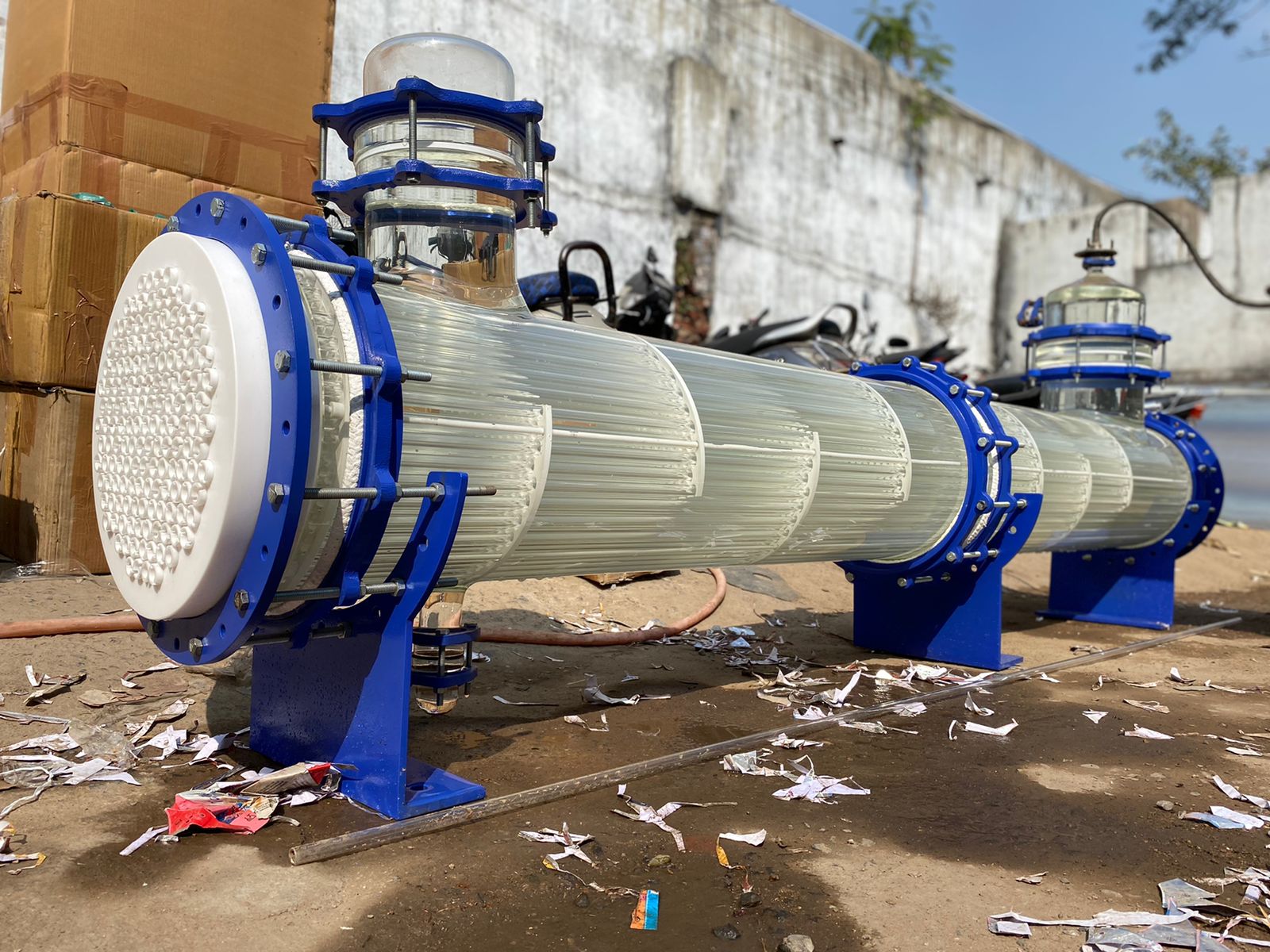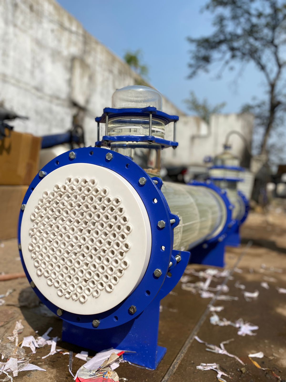 Shell and tube Heat Exchanger are for large heat transfer area, the efficiency of heat transfer and compactness. Shell and Tube Heat Exchanger are widely used as coolers, Condensers, Heaters and Evaporators. Glass Shell and Tube Heat Exchangers are reliable only when leak-free sealing is available between shell & Tube sides. There are two types of socket Sealing in Bhumi shell and tube Heat exchangers. Such as: PTFE socket with Gland Packing. PTFE socket without Gland packing. In the case of socket seal with gland packing PTFE ‘O’ Ring & PTFE Rope is used to fill the space between tube and tube sheet and PTFE socket acts as a Gland Follower to make sealing perfect and leak free. And socket without gland packing is a sealing system where the design of socket is such that while tightening. The socket gets folded at the seal point of Tube – Sheet in such a way that it does not require ‘O’ Ring or the gland rope and gives as good leak free sealing as in the first case. This unique socket type sealing arrangement permits easy replacement and cleaning of tubes. Bhumi has further improvised on the shell and Tube Evaporators and Re-Boilers with the replacement of Glass Tube by Graphite Tubes and GFT Tube – Sheets. These types are good for high temperature and high-pressure application.